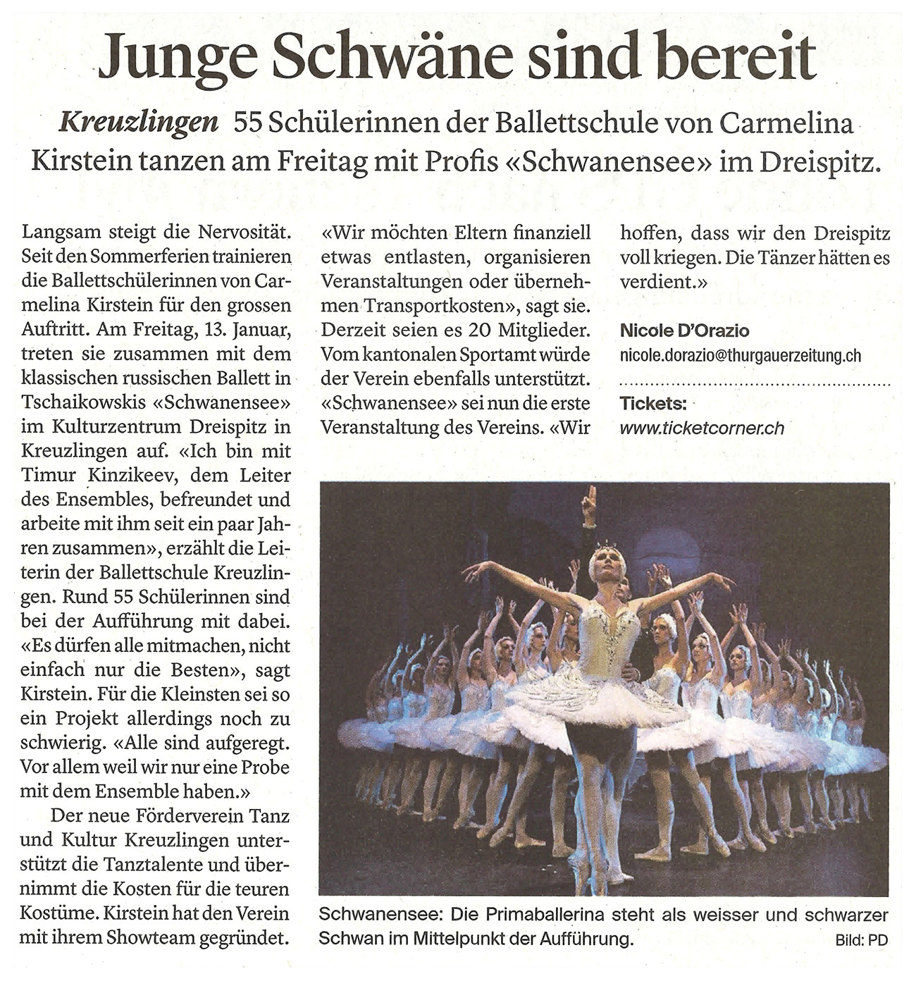 Artikel zur bevorstehenden Aufführung »Schwanensee« mit dem klassischen russischen Ballett aus Moskau und unseren Schülerinnen in der Thurgauer Zeitung vom 11.01.2017.
