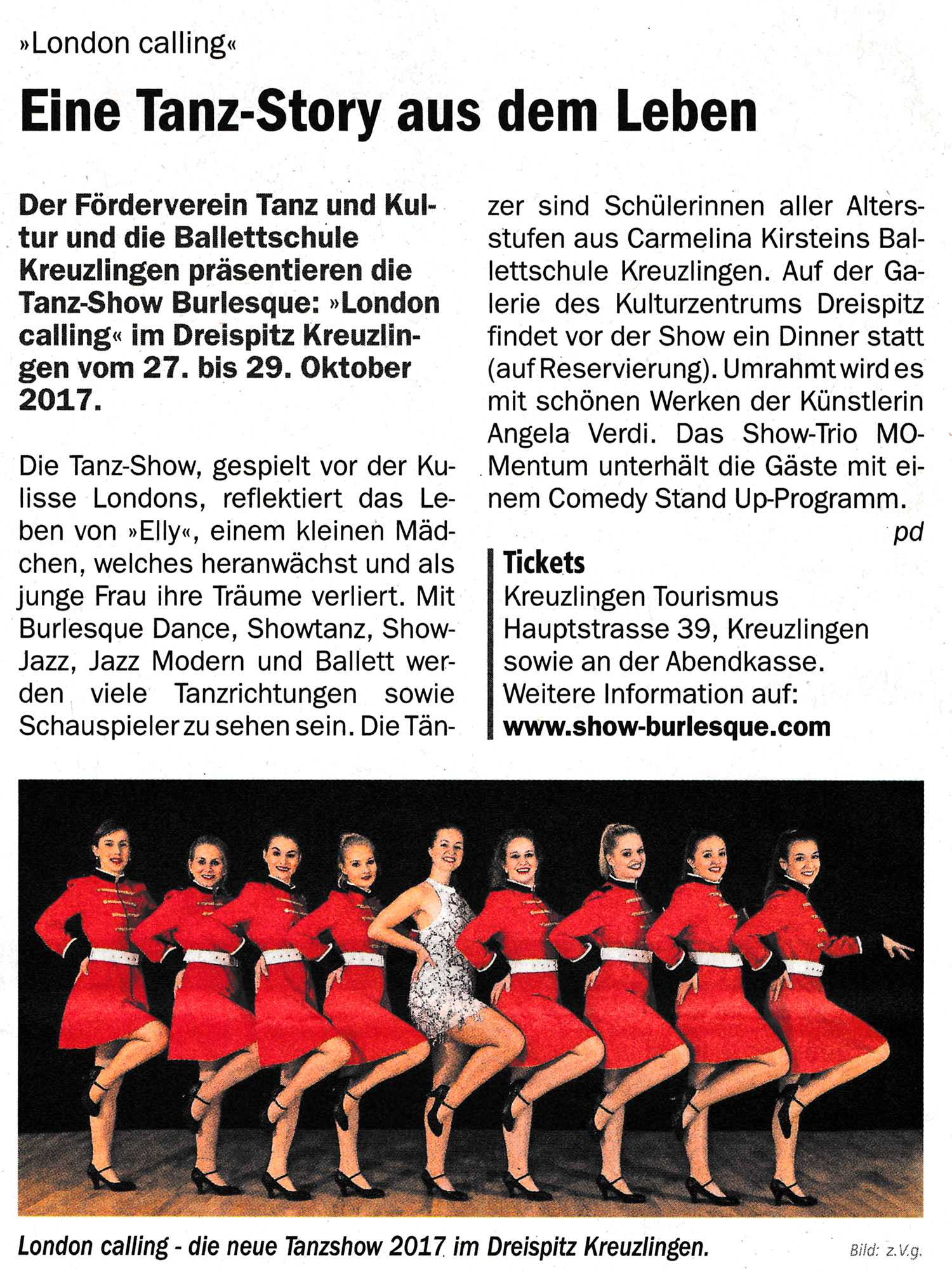 Bericht zur bevorstehenden Tanz-Show BURLESQUE »London calling« am 27. – 29. Oktober 2017 im Dreispitz in den Kreuzlinger Nachrichten.