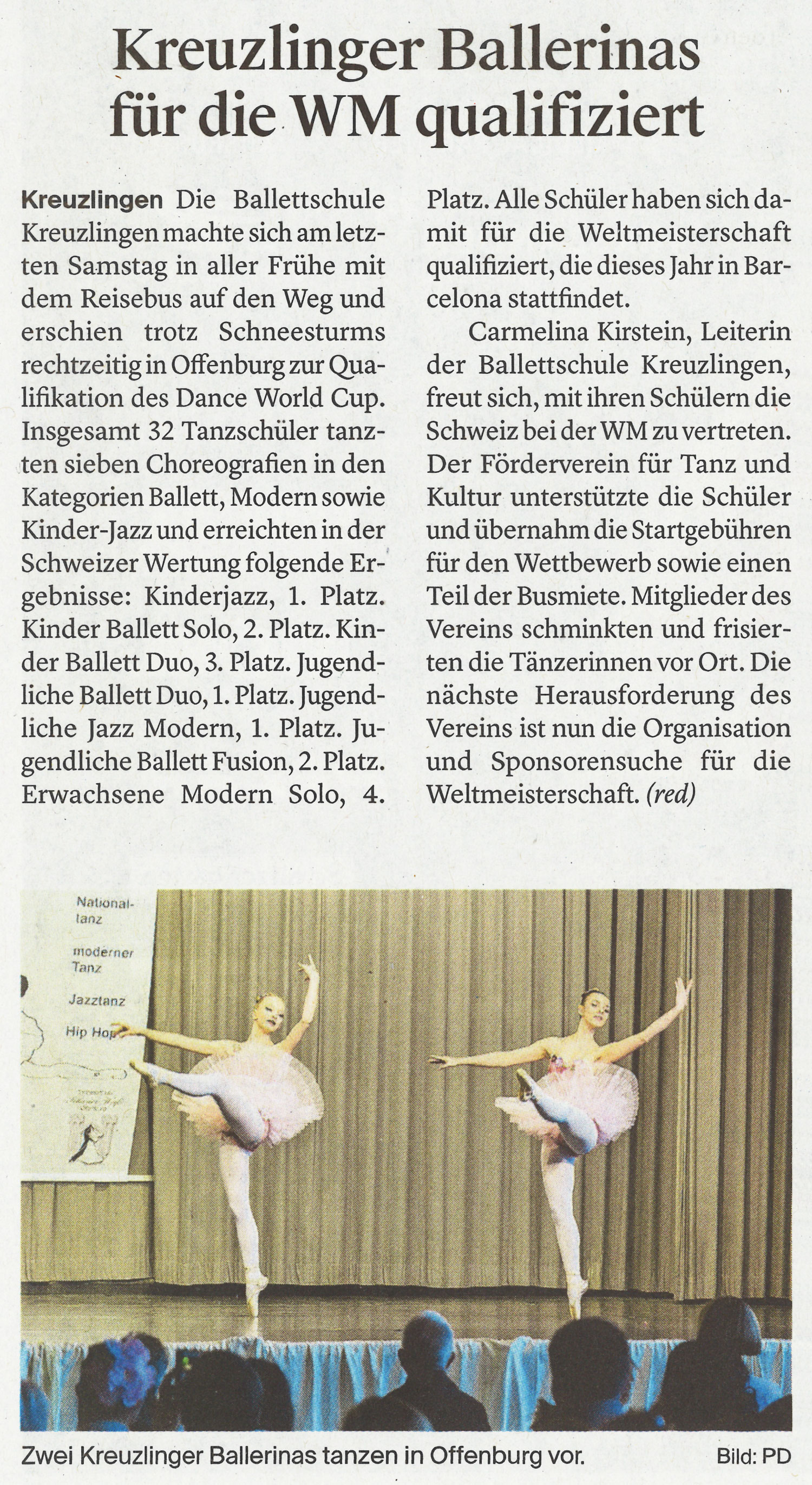 Artikel zum Erfolg unserer Tanztalente auf der Weltmeisterschaft 2021 in den Kreuzlinger Nachrichten vom 26.08.2021.