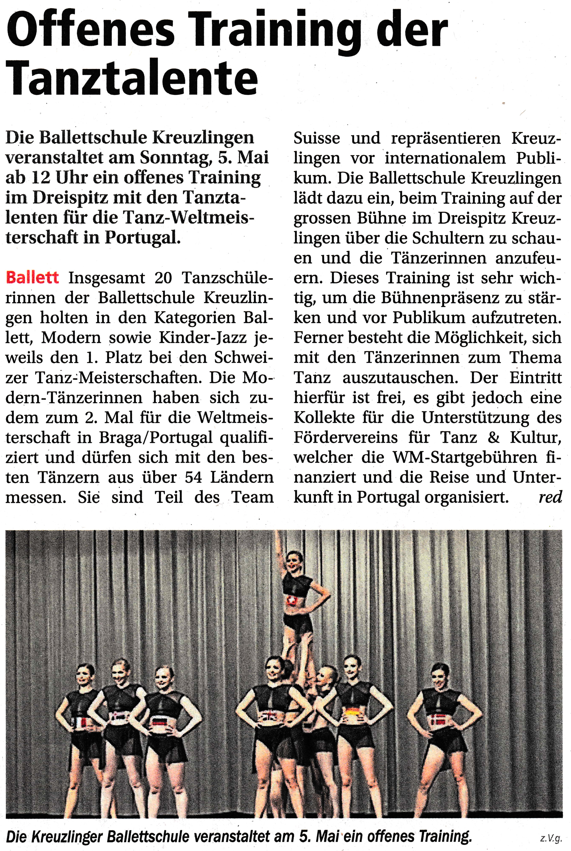 Artikel zur offenen Probe für Tanz-Weltmeisterschaft im Dreispitz in den Kreuzlinger Nachrichten vom 02.05.2019.