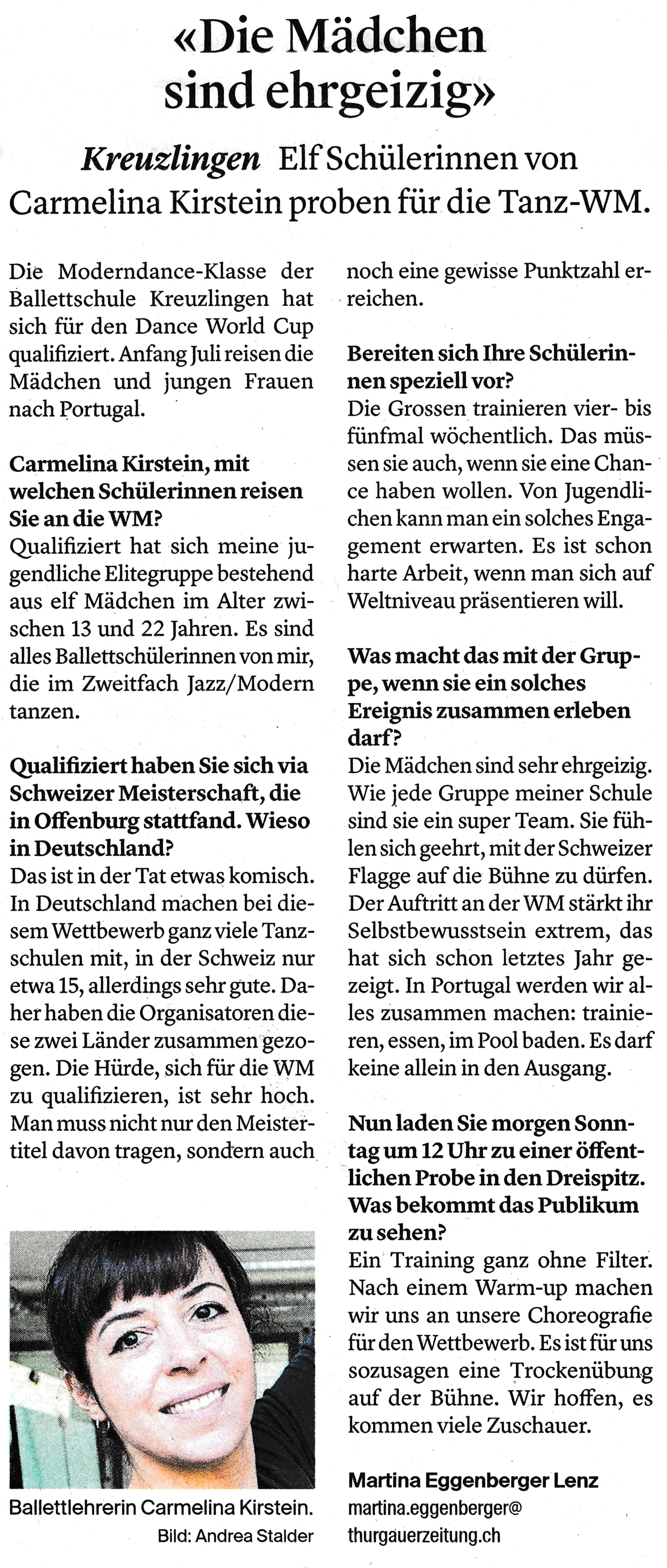 Artikel zur offenen Probe für Tanz-Weltmeisterschaft im Dreispitz in der Thurgauer Zeitung vom 04.05.2019.